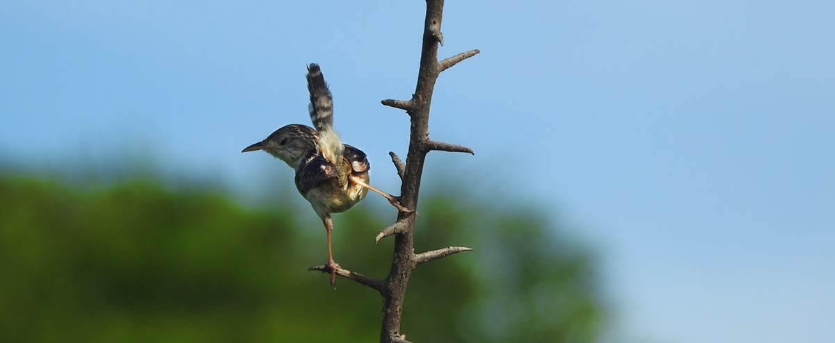 Conocido como Saltapared sabanero, es un ave pequeña y esquiva que habita en pastizales y humedales de América. Es una especie de ave paseriforme de la familia Troglodytidae. Prefiere áreas abiertas con vegetación densa, como pastizales, praderas húmedas y bordes de pantanos. Su distribución abarca desde el centro de México hasta el sur de Sudamérica, adaptándose a diversos climas y altitudes. Se alimenta principalmente de insectos, arácnidos y otros invertebrados que encuentra en el suelo o entre la vegetación. Construye nidos esféricos de hierba y otros materiales vegetales, generalmente ocultos entre la vegetación baja. El macho puede construir varios nidos, aunque solo uno será utilizado por la hembra para la puesta de huevos. Es un ave territorial y vocal, con un canto característico que utiliza para delimitar su territorio y atraer a las hembras. El canto es complejo y musical, con una variedad de gorjeos, trinados y zumbidos. Los machos poseen un repertorio amplio de cantos, los cuales usan para atraer a las hembras o para defender su territorio de otros machos. El canto se utiliza principalmente para la defensa del territorio, marcando los límites y advirtiendo a otros machos. También es fundamental en el cortejo, donde el macho utiliza su canto para atraer a las hembras. A menudo se describe como una serie de notas rápidas y agudas, con un patrón variable. Durante la época de cría, el macho suele posarse en lugares elevados, como ramas o tallos de hierba, para cantar y ser escuchado a mayor distancia. Suelen ser difíciles de observar debido a su pequeño tamaño y su hábito de ocultarse entre la vegetación.