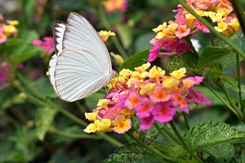 Sus alas son redondeadas, en un tono que va de blanco a crema, en el borde las alas se aprecia una coloración obscura. Es común observarla cuando está alimentándose del néctar de las flores.