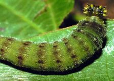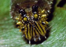 Las larvas duran de 10 a 15 días, durante los cuales se alimentan intensamente. Son de color verde con manchas café en todo el cuerpo, una franja blanca en el costado y cabeza negra con protuberancias en formas de espinas de color verde. Cuando se ha alimentado lo suficiente, tarda un día o dos en formar la prepupa, que queda colgando con un hilo de seda de la hoja. La pupa es de color verde, con ojos falsos y dos franjas color café en la parte frontal,