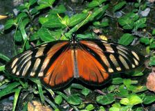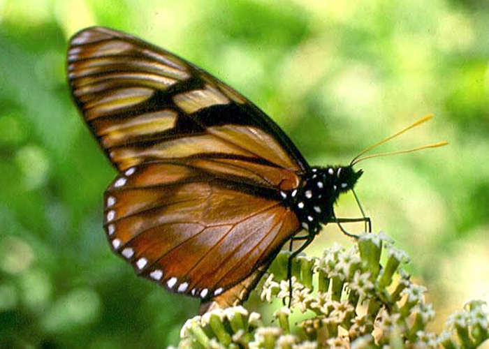 Hoy presentamos una mariposa diurna bastante común y que imita el patrón de color naranja y listado (i.e. con rayas negras) de varias otras especies: Lycorea ilione, llamada por algunas personas “Mariposa plebeya”, en tanto que otras le conocen como “Mariposa reina de alas cristalinas”.