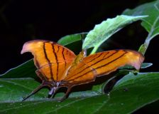 Es de hábitos solitarios y le gusta descansar debajo de las hojas. Dorsalmente sus alas son anaranjadas con líneas negras verticales. Los machos tienen un color más fuerte y las líneas negras más marcadas. Por la vista ventral, las alas tienen un tono café tornasol. En las alas posteriores tiene dos prolongaciones en forma de cola o listón, curiosamente una más corta que la otra. Cuando está reposando con las alas plegadas parece una hoja seca.