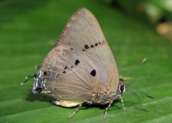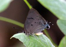 Al igual que varias otras especies, la mariposa sedosa de manchas negras posee ornamentaciones en forma de ojos, llamados “ojos falsos” en el dorso de las alas posteriores, manchas rojas y azules, y antenas falsas en sus colas cortas con puntas blancas. Este mimetismo les ha resultado exitoso para engañar a los depredadores, pues es frecuente encontrar individuos sin partes de las alas donde se ubicaban el ojo y la cola, que han escapado al ataque de aves. Incluso, se ha demostrado que la cabeza falsa es una defensa eficaz contra las arañas saltarinas (Salticidae).
