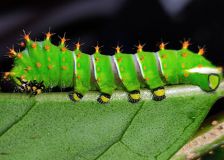 En cautiverio, las orugas pueden alimentarse de higuerilla (Ricinus communis. Las orugas (larvas) cuando emergen del huevo tienen una ornamentación en franjas transversales amarillas y negras intercaladas, con al menos 5 tubérculos amarillos que se tornan rojos en su tercer estadio o instar (es decir, su tercera etapa de desarrollo hacia la madurez sexual) y que se pierden totalmente durante su última etapa. Es en esta cuando las larvas comenzarán a producir un hilo de seda y se envolverá en un capullo muy prolijo de forma ovoide, con colores que van desde el marrón al gris claro.