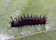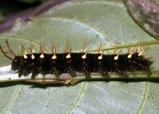 La larva madura es de color marrón, textura aterciopelada y con tres pares de espinas naranja amarillentas por segmento. Su cabeza es negra brillante de la que surgen dos cuernos curvados y gruesos. Las espinas le sirven como defensa contra sus depredadores.