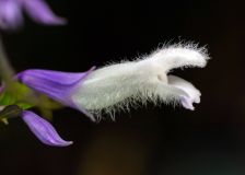 Las flores, que rara vez aparecen, crecen en forma de espiral en inflorescencias con 6 flores blancas, curvadas y cubiertas de pelos, con un cáliz violeta pequeño que está cubierto de pelos y glándulas. En su hábitat nativo, lo hace desde septiembre hasta mayo.